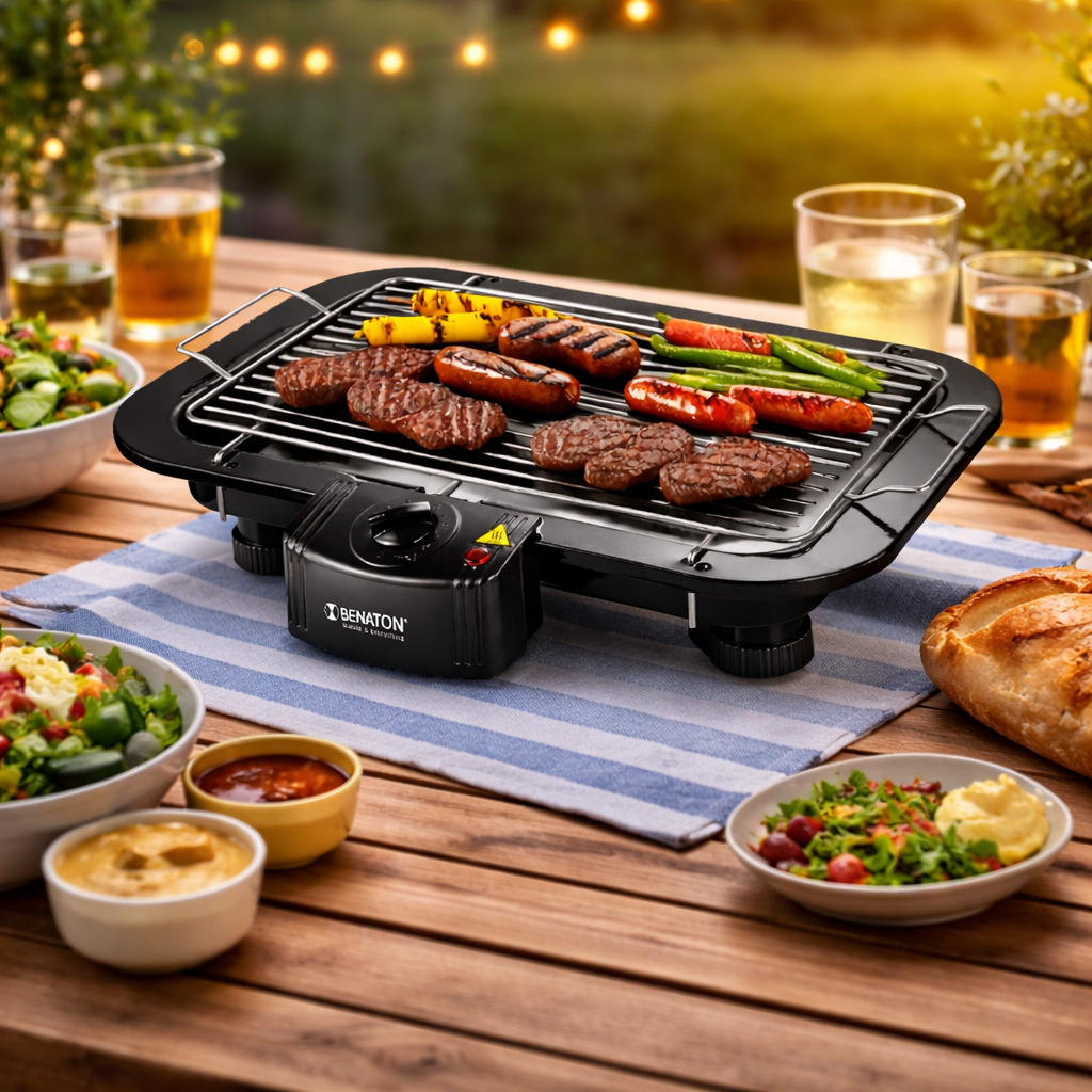 גריל חשמלי איכותי מבית BENATON, המאפשר ליהנות מחוויית "על האש" בצורה נוחה, נקייה ובטוחה – ללא צורך בפחמים או גז.