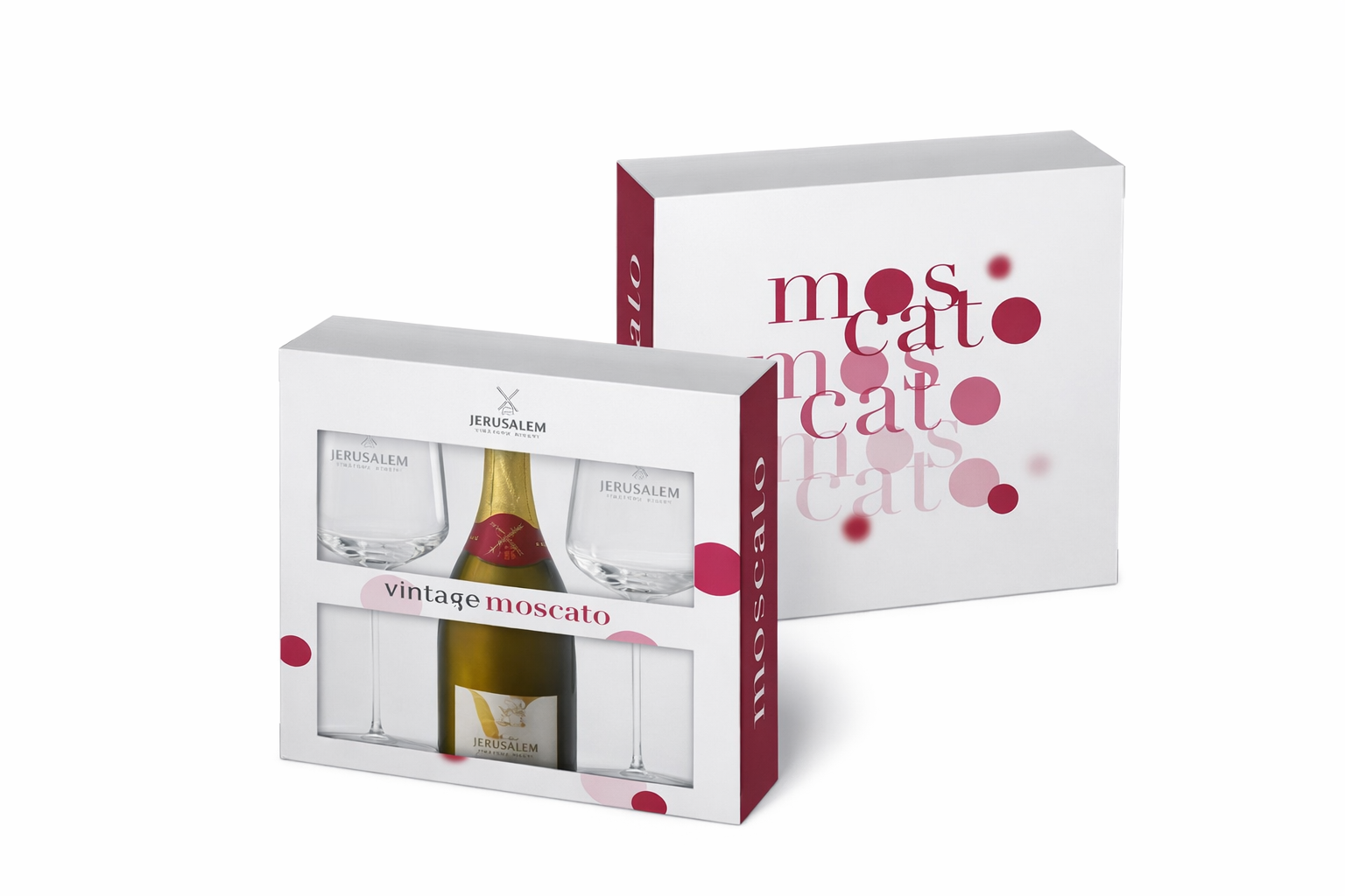 מארז יוקרתי הכולל יין מבעבע וינטג' מוסקטו מבית יקבי ירושלים וזוג כוסות יין אלגנטיות. מתנה מושלמת לחגים, לאירוח ולמתנות לעובדים וללקוחות.