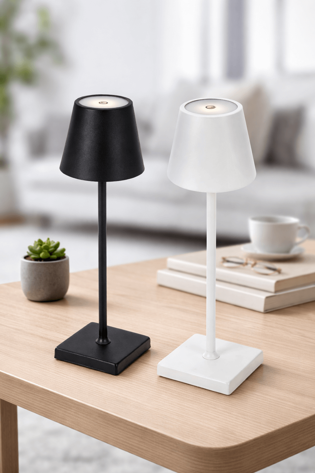 מנורת שולחן נטענת בעיצוב מודרני ונקי, המתאימה לשימוש גם בחללים פנימיים וגם בחוץ.