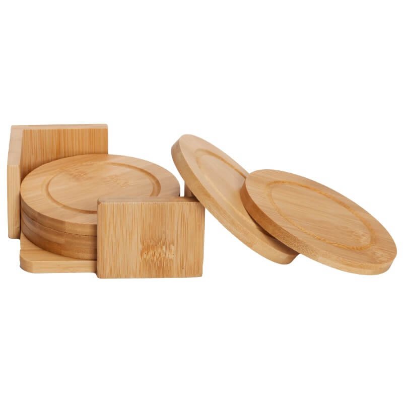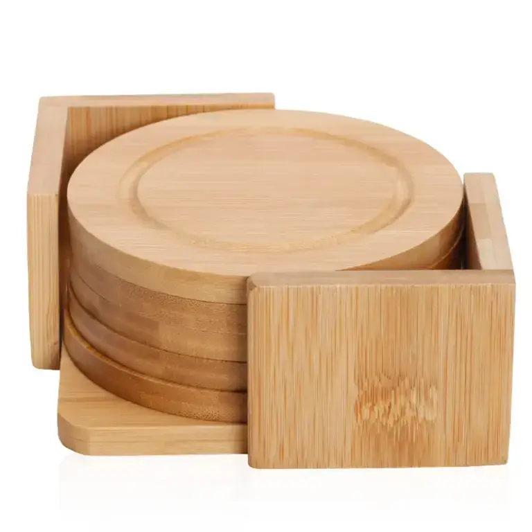 סט 5 תחתיות עגולות עשויות במבוק איכותי, במראה טבעי ונקי, כולל מעמד במבוק תואם לאחסון מסודר ואסתטי. פתרון פרקטי ואלגנטי לשולחנות משרדיים, חדרי ישיבות, עמדות אירוח ומארזי מתנה לעובדים ולקוחות.